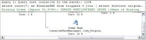 Note the green text "Missing Index", Right clicking on this, then click "show missing index details" creates the index creation statement: