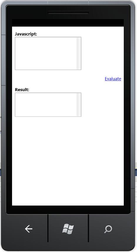 <!DOCTYPE html PUBLIC “-//W3C//DTD XHTML 1.0 Transitional//EN””http://www.w3.org/TR/xhtml1/DTD/xhtml1-transitional.dtd”><html xmlns=”http://www.w3.org/1999/xhtml”> <head> <title>Javascript Evalulator</title> <meta http-equiv=”Content-Type” content=”text/html; charset=UTF-8″ /> <meta name=”viewport” content=”width=400; user-scalable=no”; </head> <body sytle=”font-family: Arial, Helvetica, sans-serif;”> <b>Javascript:</b><br> <textarea id=”taJS” rows=”7″ cols=”27″></textarea> <p align=”right”> <a href=”javascript:evaluate();”>Evaluate</a> </p> <b>Result:</b><br> <textarea id=”taResult” rows=”5″ cols=”27″></textarea> <script language=”javascript”> function evaluate() { var JS = document.getElementById(“taJS”); var Result = document.getElementById(“taResult”); Result.value = eval(JS.value); } </script> </body></html>