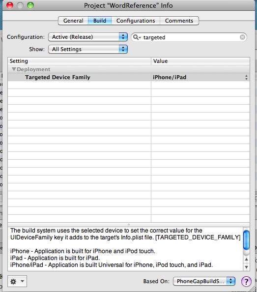 Once there, search for “Targeted” in the search box, and change the value from iPhone to iPhone/iPad.