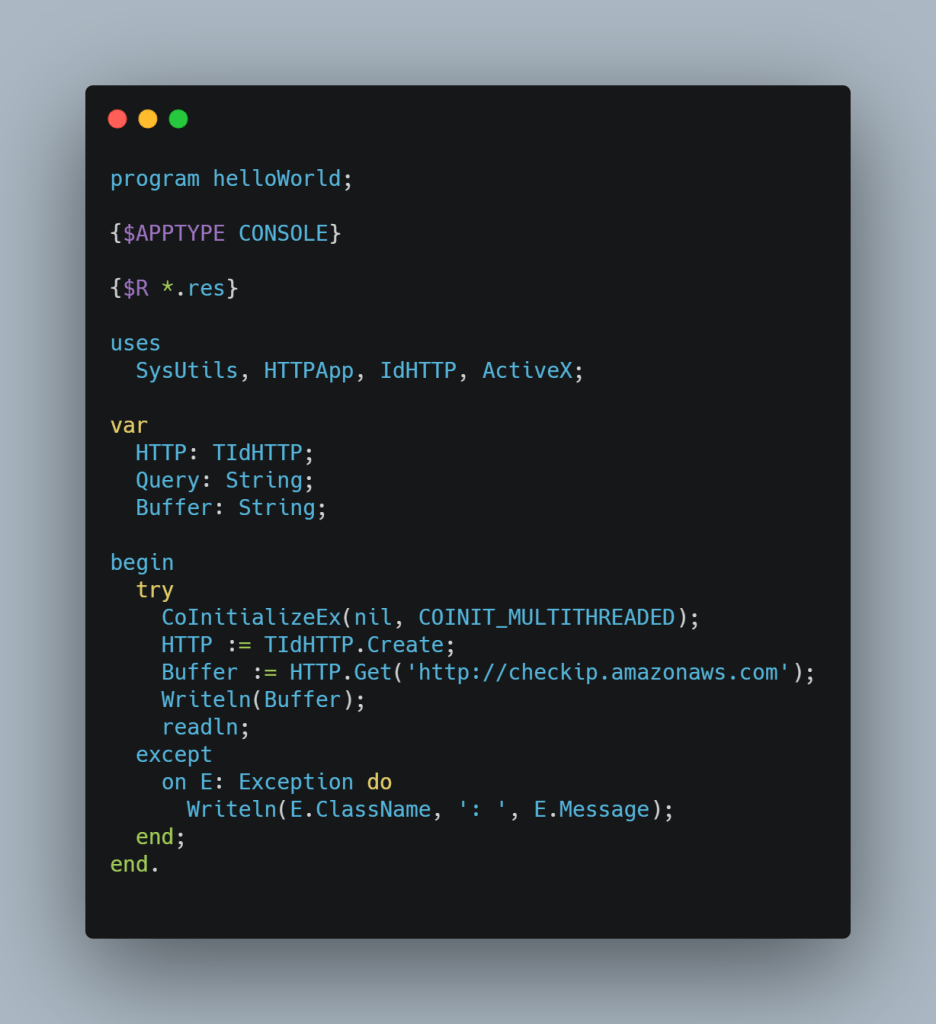 So far so simple. I make a crazy call out to CoInitializeEx which does some COM initialization (COM – oh dear). Anyway, then I create a TidHTTP object, which comes from the Indy Project (https://www.indyproject.org/) and then makes a simple GET request, and prints the output to console.